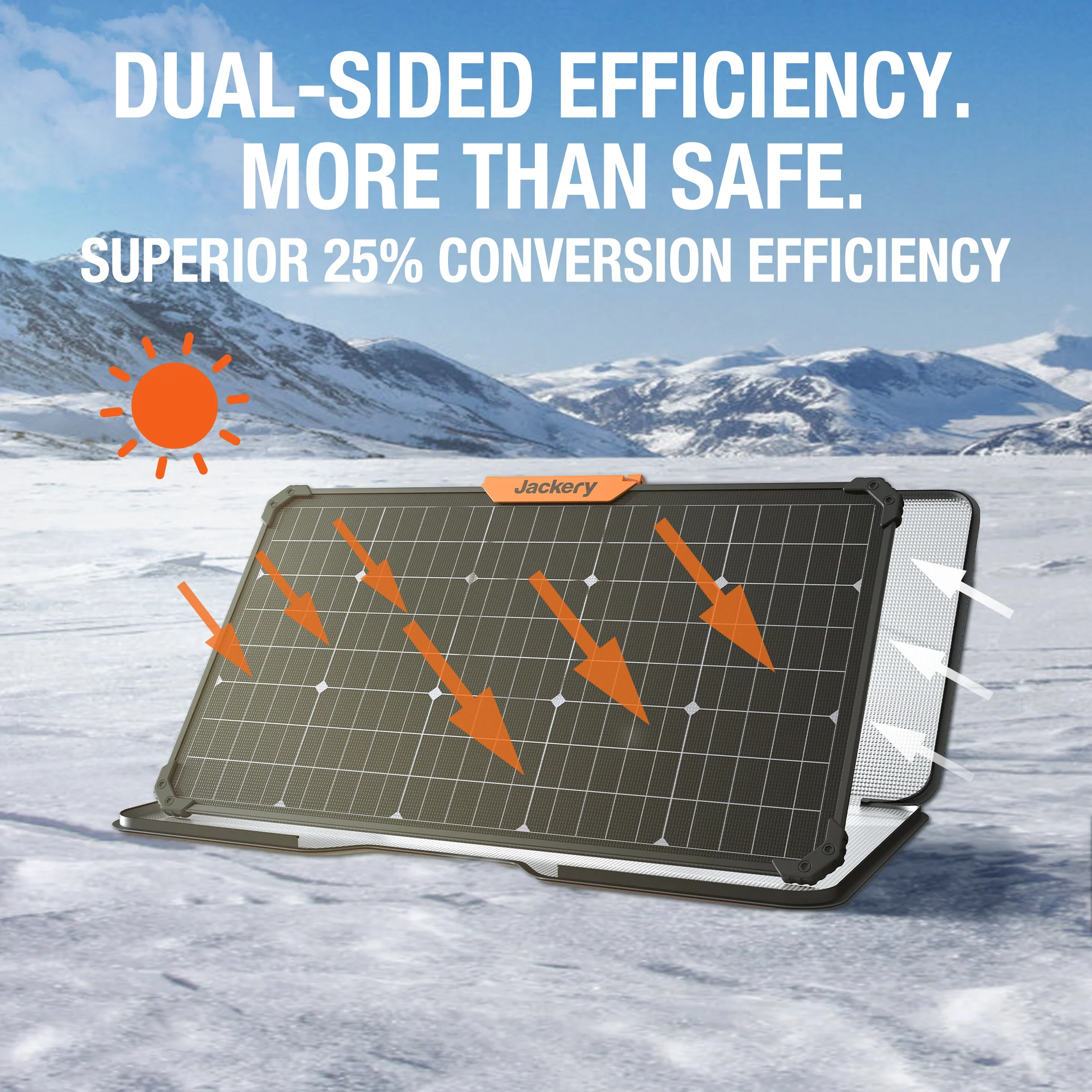 - Dual-Sided Panels Enhanced Solar Efficiency: The upgraded solar panel can generate electricity from both sides. Extra-white glass (95% transmittance rate) used on the back panel helps boost conversion rate. A reflective lined carrying bag is specially designed to reflect extra solar energy.